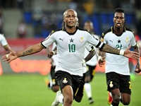 Мяч, однако, лучше держался у Ганы. Другое дело, что конголезцы сознательно отдали территорию, а комбинировать у «черных звезд» получалось в основном в середине поля, где соперник давал больше свободы. Однако едва подопечные Гранта пробовали подобраться ближе к воротам, как «леопарды» начинали действовать гораздо плотнее. Мулумба даже перестарался разок, отоварив убегавшего Айю по ногам, что стало поводом арбитру выписать первое предупреждение. Ганцы пытались раскачать оборону противника за счет техничных флангов, где работали моторные Атсу с Айю, однако максимум, что удавалось им извлечь из наступления – корнеры. Партею удалось выиграть воздух после одной из подач от флажка, но под мяч Томас толком не подстроился и удар смазал. А конголезцы, терпеливо ждавшие своего шанса, в середине тайма огрызнулись ещё одним голевым моментом. За счет длинной диагонали вперёд вышли из обороны. Мбокани зацепился за мяч, рванул в штрафную, собрал троих защитников и выложил мяч набегавшему Кабананге. Лучший бомбардир турнира без сопротивления пробивал в дальний верхний угол, но мяч свалился с ноги и ушёл порядком выше и в сторону. А было время пробить и получше.