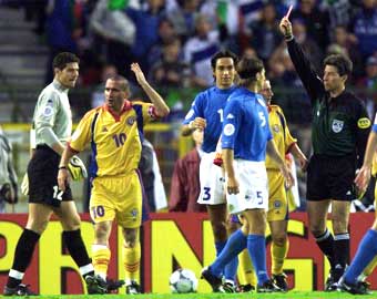 Итальянцы без особого труда пробиваются в полуфинал чемпионата Европы, забив два безответных мяча уже в первом тайме. Во втором тайме лидер румын Георге Хаджи был удален с поля и судьба матча была практически решена. Перед матчем со сборной Италии у Румынии возникли серьезные проблемы. В стартовом составе отсутствовали четыре основных игрока - трое дисквалифицированных и травмированный Георге Попеску. Но зато после дисквалификации вернулся лидер сборной Георге Хаджи, который по словам главного тренера румын может заменить на поле четверых. В составе итальянцев сюрпризов не было, а забивший победный гол в матче со шведами Алессандро Дель Пьеро вновь оказался на скамейке запасных. Матч начался очень нервно для обеих команд. Румыны с первых минут применяли прессинг по всему полю и имели территориальное преимущество. Итальянцы грамотно оборонялись, сознательно отдавая инициативу, и быстро контратаковали. Впереди на грани оффсайда в сборной Италии действовал Индзаги, а в организациях атак были задействованы Тотти, Фиоре и Альбертини. Именно эти игроки в первом тайме создавали львиную долю голевых моментов. На 33 минуте состоялся первый гол - Фиоре отдал передачу Тотти, тот воспользовавшись несогласованностью защитников при оффсайдной ловушке вошел в штрафную и с 8 метров послал мяч в дальний угол. Румыны уже через минуту могли отыграться, длинным пасом отрезавшим всю итальянскую оборону Хаджи был выведен к воротам Тольдо, вратарь кинулся навстречу полузащитнику, но Хаджи перекинул мяч через вратаря. Мяч ударился в штангу и защитники разрядили обстановку. В следующей атаке итальянцев счет мог стать 2:0, но Тотти получив мяч оказывается на похожей позиции когда забивался первый гол, на этот раз нападающий пробил мимо ворот. На 43 минуте защита румын ошиблась во второй раз. Индзаги после ювелирного паса Альбертини вышел один на один со Стелей, не стал сближаться и точно пробил мимо вратаря. Затем наступил черед Хаджи. Сначала лидер румынской сборной наступил на ногу Конте, травмировал его и получил горчичник. Затем Хаджи переругался с арбитром. И через 5 минут после легкого прикосновения Дзамбротты в штрафной итальянцев артистично упал в штрафной и справедливо получил второй горчичник за симуляцию. Негодующий Хаджи отправился в раздевалку, а его команда оставшись вдесятером заиграла в более быстрый и комбинационный футбол. Но одиннадцатого игрока румынам не хватало и в оставшееся время скорее итальянцы могли увеличить счет, чем румыны забить хотя бы один ответный гол. В полуфинале сборная Италии встретится с победителем пары Голландия - Югославия.