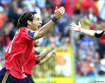 Самый захватывающий по сюжету матч в этом чемпионате. Испанцы, которым была нужна только победа, после 90 минут игры проигрывали югославам 2:3, но в добавленное арбитром время сумели провести два гола и выйти в четвертьфинал. В четвертьфинал вышли и проигравшие югославы, набрав по 4 очка вместе со сборной Норвегии югославы стоят выше по результату личной встречи. Матч с первых минут проходил зрелищно и интригующе. Первые атаки провели югославы, но испанцы быстро перехватили инициативу и создали несколько голевых моментов, самым реальным из них был удар Альфонсо на 18 минуте. С первых минут и до конца матча солировал дирижер сборной Испании - Гаиска Мендьета, именно на нем испанцы зарабатывали львиную часть штрафных ударов. Но на 31 минуте проход Друловича увенчался голом Милошевича. Нападающий остался совершенно неприкрытым в штрафной площадке и беспрепятственно пробил головой мимо Канисареса. Это был четвертый в трех матчах гол форварда из испанской Сарагосы. Ответный мяч испанцы провели только благодаря Раулю. Он выцарапал мяч в штрафной у защитников и в тяжелейшем положении отдал пас свободному Альфонсо, с ударом которого Краль справится не имел шансов. После забитого гола испанцы имели несколько реальных возможностей выйти вперед. Два раза из неплохих ситуаций промахивались Рауль и Эчеверрия. На 51 минуте испанцев ждал еще один удар, вышедший на замену в перерыве Говедарица после передачи Друловича с линии штрафной нанес мощный удар под перекладину. К чести испанцев статус-кво был восстановлен уже через минуту (как тут не вспомнить матч Испания - Словения), да и гол был точной копией пропущенного. Также вышедший на замену в перерыве Педро Мунитис после передачи Эчеверрии с линии штрафной вогнал мяч в левую девятку. На 63 минуте югославы остались вдесятером, защитник Йоканович получил второе предупреждение и был удален с поля. Это уже третье удаление югославов в матчах группового турнира. Главный тренер испанцев отреагировал на это следующим образом - он выпустил на поле четвертого форварда. И тут игра испанцев полностью расклеилась. Перестала получаться фирменная игра, пропали голевые моменты. Как играть вдесятером - югославы уже показали всей Европе (Югославия - Словения - 3:3), и на в этом матче они умудрились отличиться. Гол забил Слободан Комленович, который с 6 метров поразил сетку ворот испанцев после подачи углового. К чести испанцев они не сникли и продолжали яростно атаковать, сначала возникали полумоменты, затем уже моменты. Кульминация матча наступила в дополнительное время - на углу штрафной площади югославов был сбит Абелардо. Пенальти не стопроцентный, но арбитр уверенно показал на точку. Мендьета не оставил шансов Кралю. И в следующей же атаке испанцев мяч попал к Альфонсо, который с 10 метров расстрелял ворота югославов и принес фантастическую победу своей команде. Сборная Испании, которая после 90 минут матча не попадала в четвертьфинал, после дополнительного времени заняла в своей группе первое место, и в следующем круге встретится со сборной Франции.