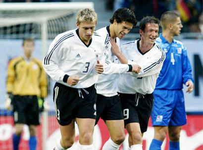 Германия на своем поле разгромила Исландию и завоевала путевку на чемпионат Европы 2004. С первых минут хозяева поля завладели территориальным преимуществом и довольно быстро сумели повести в счете. После скидки Бобича с убойной позиции ворота Арасона расстрелял Михаэль Баллак. Вскоре Германия могла удвоить счет, но выгодные моменты не реализовали Вернс и Кураны. А вот на 15-й минуте Германия вполне могла пропустить ответный гол. С передачи Гудойнсена один на один выскочил Индриги Сигурдссон, но пробил мимо ворот. На 22-й минуте Бобич после великолепного паса Кураны обязан был забивать второй гол, но не сумел переиграть голкипера. В концовке тайма обе команды обменялись острыми атаками с участием Хельги Сигурдссон и Шнайдера. Кульминация матча наступила на 58-й минуте. После розыгрыша углового ударом головой ответный гол забил Хрейдарссон, но российский арбитр Валентин Иванов не засчитал взятие ворот из-за нарушения правил. Исландцы бурно протестовали, а спустя минуту пропустили второй гол. После быстрой контратаки отличился Фреди Бобич, забивший с передачи Кураны. На 79-й минуте Исландию добил Кураны, который довел счет до разгрома с передачи вышедшего на замену Клозе.