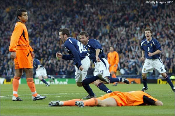 Сборная Шотландии в первом стыковом матче с минимальным счетом переиграла на своем поле Голландию. Гол, забитый в первом тайме нападающим Макфадденом, стал серьезной заявкой сборной Шотландии на выход в финальную стадию чемпионата Европы 2004. Впрочем Голландия, которая располагает великолепными игроками атаки, в ответном поединке имеет все шансы оформить нужный результат. Дебютный минуты матча остались за голландцами, создавшими первый голевой момент. После розыгрыша штрафного в исполнении Ван дер Мейде мог забить Клюйверт, но его удару не хватило точности. Однако в дальнейшем шотландцы завладели территориальным преимуществом. В составе хозяев поля выделялся нападающий "Эвертона" Макфадден, который и стал героем матча. На 22-й минуте после розыгрыша углового Макфадден сыграл в стенку с Флетчером и пробил по воротам. Мяч рикошетом от ноги Франка Де Бура перелетел через Ван дер Сара. Вторая половина первого тайма прошла в яростных атаках голландской сборной. Сначала вратарь Дуглас парировал опаснейший удар Стама, а затем Ван дер Мейде с убойной позиции пробил выше ворот. На последних минутах голландцы чудом не сравняли счет. После удара головой Де Бура мяч летел в сетку ворот, но в последний момент Найсмит подстраховал голкипера. Во втором тайме голландцы продолжали атаковать. Уже на 1-й минуте Ван Нистелрой бил практически в упор, но попал в голкипера. Затем могли забить Стам, Клюйверт, а Ван дер Мейде пробил в перекладину. На 74-й минуте выгоднейший голевой момент упустил Зеедорф. Не смотря на титанические усилиями атаки голландской сборной хозяева поля выстояли и удержали минимальное преимущество.