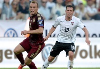 Австрийцы увереннее начали встречу. Они быстро наладили контроль над мячом и смело шли вперед большими силами. В одном из своих стартовых выпадов гости получили право на угловой, розыгрыш которого ничем запоминающимся не увенчался. Чуть позже Арнаутович отметился ударом с дальней дистанции, но в створ не попал. Что касается россиян, то толковых выпадов в их исполнении мы на первых минутах, к сожалению, не видели. Еще одним неприятным событием для нашей команды стала травма Березуцкого, который неудачно упал на спину. Василию долго оказывали медицинскую помощь, однако продолжить поединок он все-таки не смог. Вот так сборная России потеряла и второго своего ведущего центрального защитника. Фабио Капелло пришлось в спешном порядке бросать в бой Никиту Чернову. Пока россияне находились вдесятером, австрийцы упустили роскошную возможность использовать временное численное преимущество и открыть счет. Юнузович выскочил на рандеву с вратарем, но не смог хладнокровно реализовать выход один на один, бесхитростно пробив прямо в Акинфеева. Лишь на исходе первой четверти часа наши футболисты наконец-то сподобились на организацию толковой контратаки, увенчавшейся слабым ударом в исполнении Кокорина – Альмер был начеку. Австрийцы же старались не сбавлять в активности. Очевидно, что вышедшему на замену Чернову потребовалось определенное время на то, чтобы освоиться на поле, и гости сразу же постарались максимально напрячь молодого защитника. В своих следующих атаках австрийцы заработали несколько весьма перспективных стандартов, однако выжать максимум из них подопечные Марселя Коллера не сумели.