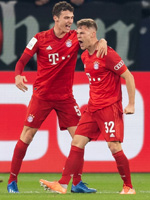 Становилось очевидно, что, по крайней мере до первого гола, “ноль-четвёртые” намерены навязать настоящую борьбу “рекордмайстеру”. Всё это не могло укрыться от чуткого взора болельщиков гельзенкирхенцев, приветствовавших каждое удачное действие своих любимцев. “Бавария”, так или иначе, продолжала доминировать. Могло ли быть иначе? Настоящим конструктором, определяющим направление большинства подходов “красных”, был Давид Алаба. Не секрет, что австриец со своим превосходным первым пасом здорово освоился на месте центрального защитника. Зачастую именно Алаба становился тем футболистом гостей, который одной передачей оставлял большинство соперников за линией мяча. После одного из фирменных забросов левоного центрдефа мюнхенцев рванувший к чужой штрафной Павар передал мяч поперёк Горецке. Леон зряче метил в дальний угол, пробив влёт, - мимо цели. Вместе с тем известно, что проповедующая сейчас тотальный футбол “Бавария” далеко не безупречна у своих ворот. На экваторе первого тайма яркой иллюстрацией тому стал гол Бургшталлера! Матондо из опорной зоны мюнхенцев проткнул мяч через ногу Алабы на Бургшталлера, который сориентировался перед воротами Нойера так, как и следует это делать мастеровитому страйкеру. Мяч затрепыхался в сетке ворот “красных”, но тут же взятие ворот гостей было отменено бригадой Штилера – в офсайде находился в момент приёма мяча футболист “кнаппен”. Раззадоренные игроки Флика спустя минуту заставили Шуберта вступить в игру. Очередной заброс в район правого полуфланга привёл к выносу мяча защитником Гельзенкирхена точно на Павара, который положил корпус и в излюбленной манере примерился по мячу с лёту – Шуберт кулаками парировал игровой снаряд в сторону! Вторая половина тайма проходила в беспрестанных атаках “Баварии”. “Ноль-четвёртые” не только забыли о том, как выглядит их бывший одноклубник Нойер, но и вообще перестали появляться на половине поля соперника. Вопрос по такой игре мог быть лишь один – сдержит ли “Шальке” гостей до свистка на перерыв? На финальные минуты тайма концентрации футболистам “горняков” всё же не хватило. После кросса Киммиха Тодибо “рыбкой” выбивал мяч за лицевую, но сфера полетела точно под перекладину, что вынудило Шуберта спасать рурцев от неминуемого гола. В конце концов, серия корнеров принесла гостям желаемый результат. После подачи Коутиньо от угла поля Бургшталлер в борьбе с Толиссо вынес мяч на линию штрафной, откуда Киммих в касание нанёс неотразимый удар низом – 0:1! Застыл на месте Маркус Шуберт, который был не в силах среагировать на мяч, вылетевший из-за спин сразу двоих “кобальтовых”. Апеллировал Бургшталлер к арбитру, считая, что нарушал на нём правила Толиссо, но тщетно. Раззабивался Йозуа Киммих, отличившийся во второй игре кряду. Для универсального футболиста “Баварии” этот гол стал четвёртым в сезоне.