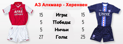 | Статистика встреч: 10-8-12 (48:55) | | Сезон 2011/2012 | | 26.02.2012 АЗ Алкмаар - Херенвен - 3:3 | | 04.12.2011 Херенвен - АЗ Алкмаар - 5:1 | | | | Сезон 2010/2011 | | 19.02.2011 Херенвен - АЗ Алкмаар - 0:2 | | 27.11.2010 АЗ Алкмаар - Херенвен - 2:2 | | | | Сезон 2009/2010 | | 06.03.2010 АЗ Алкмаар - Херенвен - 4:1 | | 23.08.2009 Херенвен - АЗ Алкмаар - 0:2 | | | | Сезон 2008/2009 | | 10.05.2009 АЗ Алкмаар - Херенвен - 3:1 | | 01.11.2008 Херенвен - АЗ Алкмаар - 3:3 | | | | Сезон 2007/2008 | | 19.01.2008 Херенвен - АЗ Алкмаар - 4:0 | | 21.10.2007 АЗ Алкмаар - Херенвен - 0:1 | | | | Сезон 2006/2007 | | 22.04.2007 АЗ Алкмаар - Херенвен - 3:1 | | 26.11.2006 Херенвен - АЗ Алкмаар - 1:3 | |