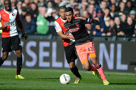Семимильными шагами амстердамский "Аякс" движется к своему четвёртому чемпионскому титулу подряд и 33-му в истории клуба. В 26-м туре команда Франка де Бура сделала едва ли не самый главный шаг к достижению поставленной цели. На горизонте осталось лишь две команды, способные помешать столичной команде - это "Твенте" и "Витесс", но в любом случае всё в руках "аяксидов" и они теперь зависят сами от себя. Восемь туров до конца и восемь очков составляет задел амстердамцев от ближайшего преследователя. Упустить чемпионский титул в такой ситуации будет обидно и глупо, хотя в футболе бывает всякое. Но всё-таки перейдём к событиям главного матча в Голландии на этой неделе. Зрелищным этот матч вряд ли можно назвать, да и спрогнозировать такое развитие событий было довольно легко. Счёт был открыт на исходе получаса игры, причём такое развитие событий было закономерным, а автором гола естественно стал лучший бомбардир "Фейеноорда" Пелле. Ключевым в матче можно назвать концовку первого тайма. Сначала у "Аякса" выбыл Кркич, получивший на ровном месте повреждение. Вместо испанца на поле появился Сигторссон и именно он не позволил "Фейеноорду" уйти на перерыв с преимуществом в счёте. Львиная доля гола на счету Рикардо Кишны. Появление в старте воспитанника "Аякса" могло вызвать удивление, но он оправдал своё появление голевой передачей как раз на исландца. Победный же мяч был забит гостями уже после перерыва, а его автором стал защитник Велтман.
