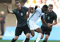 Этебо у номинальных хозяев остался в запасе. Как и Петерсен у сборной Германии. Игра началась в хорошем темпе. На 3-й минуте немцы, перехватив мяч, развернули стремительный контрвыпад, и Майер вывел на чужие ворота Гнабри, но Серж из пределов штрафной угодил в ногу защитнику. А вскоре лидер гонки бомбардиров Олимпиады схлопотал жёлтую карточку за грубый фол на Эзекиле. "Суперорлы" довольно активно шли вперёд, но раз за разом попадали в офсайдную ловушку защитников сборной Германии. А на 9-й минуте "будестим" открыла счёт. Гнабри отличной проникающей передачей в касание нашёл на правом краю штрафной Майера, тот прострелил вдоль ворот мимо голкипера, и пустые ворота расстрелял Клостерманн - 0:1. Впрочем, очень скоро африканцы едва не восстановили статус-кво. Причём, усилиями самих немцев. Хорн толком не попал по мячу, выбивая его в поле, и "подарил" сферу Садику Умару, но тот угодил прямо в голкипера. Игра продолжала развиваться на встречных курсах. Вскоре Садик Умар едва не подкараулил возможность для удара по воротам в чужой штрафной, но плохо обработал мяч, чем воспользовался Суэле. На 19-й минуте Удо за опасный подкат на Гнабри схлопотал "горчичник". А вслед за этим немцы едва не упрочили своё преимущество. Суэле на правом краю штрафной головой скинул мяч на Ларса Бендера, который пробил в касание с нескольких метров, но свою команду выручил Даниэл.