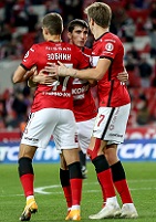 «Родина» не тушевалась перед грозным соперником и уже на второй минуте могла придать матчу интриги. Номинальные хозяева сразу со стартовым свистком выбрались в атаку, заработали штрафной, и после подачи первым на мяче был Владислав Волков – высокорослый защитник клуба ПФЛ. 42-й номер «Родины» нанёс мощный удар головой, но точности этому выстрелу, к счастью «красно-белых», не хватило. Многообещающим было начало в исполнении хозяев, но продолжить на эмоциональном порыве осаждать владения спартаковцев им не удалось. Гости, поняв, что молодой соперник заряжен, решили как можно быстрее приструнить его. Дальше «Родина» в основном оборонялась. Но не собиралась уходить в защиту наглухо. Контратаковать хозяева не стеснялись, хоть и давали им такую возможность всё реже и реже. На исходе 15-й минуты мы впервые увидели в игре вратаря «Родины» Сальникова. Кокорин проверил его ударом метров с 14 – Иван был начеку. Для голкипера это была разминка. В отличие от выстрела Крала, раздавшегося на 19-й минуте. Алекс получил мяч метрах в 22 от ворот и мощно пробил с подъёма, заставив Сальникова в бреющем полёте перевести снаряд в сторону. Эффектный получился эпизод. Не удивительно, что у «Спартака» удары наносили самые разные футболисты. «Красно-белые» атаковали практически полным составом. При этом даже Соболев и Бакаев успевал отработать в обороне в случаях попыток «Родины» убежать в контрнаступление. От Зелимхана долгое время ждали остроты, и на 30-й минуте он её создал. Неудачно «красно-белые» разыграли «стандарт», но мяч прилетел к Бакаеву, который из-за штрафной закрутил сферу в дальний угол. И снова стадион рукоплескал Сальникову, который спас свою команду. Но настоящим защитником «Родины» выступил не вратарь. А Коротков, по амплуа тоже защитник. Именно он оказался на «ленточке», когда Урунов расстреливал владения хозяев после передачи Джикии. Были вопросы касательно части тела, которой Александр остановил мяч (показалось, что рукой, но даже повтор не помог понять это точно), однако рефери не сомневался, что снаряд попал Короткову в корпус. Героическое спасение совершил Александр! Жаль только, что ненадолго он уберёг «Родину» от пропущенного гола. В следующей атаке «Спартак» забил. Теперь последовала передача в штрафную справа, и Соболев из района 11-метровой отметки отправил снаряд в левый угол – 0:1. Ассистентом выступил Зобнин. Превосходство «красно-белых» теперь было подтверждено на табло, команда Тедеско получила возможность выдохнуть.