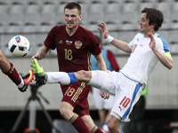 На экваторе тайма в матче произошла длительная пауза. Денисов и Дарида жестко столкнулись в центральном круге, и обоим футболистам потребовалась медицинская помощь. К счастью, оба вскоре пришли в себя и вернулись на поле. Содержание игры в эти минуты существенных изменений не претерпело. Территориальным преимуществом по-прежнему владели чехи, и они за счет фланговой активности своих игроков продолжали разыскивать наиболее уязвимые места в оборонительных построениях противника. Обилия острых моментов возле ворот Лодыгина мы не видели, но все равно некоторые подходы со стороны команды Павла Врбы таили в себе определенную угрозу. У Чеха же работы не было совсем. Не баловала нас встреча обилием ярких моментов, что неудивительно. Все-таки матч был товарищеский, и командам в нем не имело смысла чрезмерно напрягаться. На 37-й минуте мы впервые за долгое время увидели акцентированный удар по воротам в исполнении одной из команд. Это Дарида отважился на выстрел из-за пределов штрафной площади – Лодыгин был начеку. Отметим, что Павел Врба еще до перерыва решил провести первую замену в составе своей команды. Вместо Дочкала в игру вступил Скалак. Пока свежий футболист осваивался на поле, россияне соорудили симпатичную многоходовую комбинацию. Обменявшись короткими передачами с Дзюбой, Кокорин вывел Смолова на свидание с Чехом, но Федор не смог переиграть голкипера «народной команды» в ближнем бою. Великолепный шанс отличиться упустил лучший бомбардир российской Премьер-Лиги сезона 2015/16 годов. Под занавес основного времени первого тайма сборная Чехии получила право на весьма многообещающий штрафной. Данный стандарт взялся исполнить Лафата и пробил прямиком в руки Лодыгину. На этом неяркая и скупая на интересные моменты первая сорокапятиминутка подошла к концу.