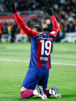 Однако «Барселона», введя мяч в игру, не бросилась сразу в атаку, а играла предельно осторожно. Это неудивительно, ведь для Хави сейчас как никогда важен результат. Разозлённый поражением от «подводников» Канселу, взявший большую часть вины за неудачу на себя, отметился в дебюте встречи ударом с угла штрафной площади — мяч прошёл мимо ворот. А потом Хави пришлось хвататься за голову: Ферран Торрес оступился на левом фланге (на повторе видно, что Унай Гарсия его не коснулся) и получил травму, после которой был вынужден покинуть поле, держась рукой за лицо и хромая. Кажется, эпидемия травм будет мучить «Барселону» весь этот сезон. Вместо пострадавшего пришлось экстренно выпускать Фермина Лопеса. Левандовски, собравший партнёров после заявления об уходе Хави, чтобы настроить их на остаток сезона, старался проявить себя больше остальных. И если первый его удар был заблокирован защитником, то второй смотрелся куда опаснее: Ямал, вынудив сфолить на себе Мохика, заработал штрафной удар на правом фланге, и поляк, воспользовавшись навесом Гюндогана со стандартного положения, пробил головой в угол ворот — мяч прошёл рядом со штангой. «Барса» основательно прибрала инициативу к рукам (хозяева к 20-й минуте владели мячом 67% игрового времени), заставляя соперника срывать атаки ценою фола и сажая игроков «Осасуны» на жёлтые карточки — одном из эпизодов Унай Гарсия грубым подкатом сбил с ног Левандовски. Впереди за этот отрезок времени «красные» запомнились только двумя угловыми подряд у ворот Пеньи. Перед одним из них Кунде отмахнулся от Ороса, но арбитр на действие французского защитника никак не отреагировал. А потом ещё Араухо в своей штрафной сыграл в подкате против Арнаиса, после чего тот повалился на газон. Рефери не усмотрел нарушения правил и продолжил игру, назначив удар от ворот. «Барселона» продолжила атаковать. Ямал точной подачей нашёл на дальней штанге Фермина Лопеса, вот только ударить в направлении ворот у хавбека «сине-гранатовых» не вышло и мяч полетел в обратную сторону. Канселу играл с такой страстью, что завалил Аресо на газон, после чего получил удар локтем в лицо, а вместе с ним и рассечение. Пролилась первая кровь, пришлось португальцу ненадолго покинуть пределы поля. «Барселоне» же нужно было атаковать, а не обороняться, хотя никаких сверхзадач хозяева предложить сопернику до перерыва так и не сумели. Острота у ворот голкипера «Осасуны» Фернандеса возникала только после стандартных положений. Опасно бил головой Кунде после навеса от углового флажка, но мяч прошёл выше перекладины. А потом Фернандес, сократив дистанцию, отбил мяч после удара Фермина Лопеса с острого угла.