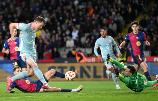 Результативное пиршество устроили в первом полуфинале Кубка Испании «Барселона» и «Атлетико», оставив максимум интриги на второй поединок. Хотя несколько раз по ходу этой встречи казалось, что никакой интриги не останется. Уже к шестой минуте «Атлетико» вел со счетом 2:0, и все вело к катастрофе и провалу «Барселоны». Но та оказалась не лыком шита, быстро собралась, устроила мощный накат на соперника и с интервалом в пару минут забила дважды, а в конце тайма вовсе вышла вперед. После перерыва «Атлетико» уже не так прижимался к воротам, игру подровнял, но острее выглядели каталонцы, которые забили-таки свой четвертый мяч. И теперь уже вроде бы добивали противника они. Но у «Атлетико» нашлись силы на новый переворот – менее чем за десять минут в самом конце поединка мадридцы забили дважды и увезли ничью. Сумасшедший матч получился. И ответный тоже должен быть ярким. ![]() фото - Getty Images. Мощная вывеска в полуфинале Кубка Испании сложилась: бьются конкуренты и за чемпионство. «Барселона» делит первое место в Ла Лиге с «Реалом», а «Атлетико» уступает им всего одно очко. И «Барселона», и «Атлетико» давно не проигрывали. У мадридцев серия длится восемь матчей, а у каталонцев – 13. Причем только дважды на этом отрезке «Барселона» сыграла вничью. У нее сейчас пять побед подряд. В прошлом туре был бит «Лас-Пальмас» (2:0), перед этим – «Райо Вальекано» (1:0) и «Севилья» (4:1). А в Кубке Испании выбили последовательно «Барбастро» (4:0), «Бетис» (5:1) и «Валенсию» (5:0). «Атлетико» в прошлом матче обыграл «Валенсию» (3:0), ранее сыграл вничью с «Сельтой» (1:1) и «Реалом» (1:1). В Кубке на предыдущих стадиях «матрасники» выбили «Хетафе» (5:0), «Эльче» (4:0) и «Марбелью» (1:0). Ранее в этом сезоне в чемпионате «Атлетико» обыграл на выезде «Барселону» (2:1). Что касается потерь, то у хозяев отсутствуют тер Штеген, Кристенсен, Берналь, а у гостей – Коке и Аспиликуэта. Матч очень мощно начали гости, проведя сразу опаснейшую атаку. Гризманн с правого края выдал навес на Альвареса, который из центра штрафной пробивал под перекладину, однако Щенсны не проспал дебют встречи. А вот розыгрыш корнера оказался результативным. Быстрая комбинация привела к навесу Гризманна, который подправил Лангле, а Альварес расстрелял ворота. 0:1. Каталонцы не были готовы к такому рывку мадридцев, поэтому несколько растерялись. И «Атлетико» этим вновь воспользовался. Альварес здорово сыграл на перехвате в центре поля, сохранил мяч и выдал проникающий пас на Гризманна, который убрал Бальде и зарядил в цель. 0:2. Не прошло и десяти минут матча. Вернуть хозяев в игру попытался Ямаль, который исполнил дальний удар, но в створ немного не попал. Забив быстро два мяча, «Атлетико» сам словно притормозил. Это позволило «Барселоне» прийти в себя, а не проваливаться дальше. Каталонцы стали перехватывать мяч и двигаться вперед большими силами. Уже на 12-й минуте Педри через Рафинью вывел Торреса чуть ли не один на один, но Муссо вовремя двинулся вперед и парировал удар Феррана. Стал разгонять игру и Ямаль, который оживился, получал часто мяч и стал накручивать раз за разом Галана. Тот быстро присел на желтую карточку, потому что не успевал за Ламином. Прижали постепенно хозяева мадридцев и смогли этим воспользоваться. Ямаль справа обыгрался с Кунде, который прострелил в центр штрафной мощно в ногу набегавшему Педри, который ра