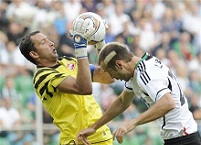 Войцех Скаба в падении выбил мяч в район одиннадцатиметровой отметки, откуда