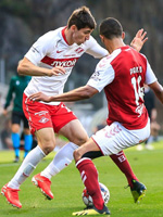 С оборонительной линией Кононов, похоже, определился, выставив привычное сочетание. В опорной зоне вышли Зобнин и Гулиев, Бакаев и Мирзов расположились на флангах, а Шюррле – в оттяжке под выдвинутым на острие Понсе. Осторожно и на невысоких скоростях начали команды. На быстрый гол явно никто не ставил – прощупывали, много играли назад и поперек, большими силами вперед не шли. «Спартак» эпизодически вспыхивал в высоком прессинге, но опять же не прослеживалась установка, как порой бывало по весне, задушить соперника. Треть тайма прошла, по сути, без ворот. На её исходе Шюррле получил по ногам чуть левее дуги. Долго они с Джикией готовили удар. В итоге исполнял все же немец, но пробил сильно выше цели. И снова то же вялотекущее перекатывание мяча. Понятно, что в Португалии было выше тридцати за окном, и это сказывалось, но первую половину тайма можно было бы спокойно промотать в ускоренном режиме – беготня, борьба, брак в передачах. Хозяев статус обязывал идти вперед, выхолощенный дерби «Спартак» явно действовал в экономном режиме. «Брага» создала первый момент на экваторе тайма. Стандарт смотрелся не особо острым, но Палинья здорово отклеился от опекуна, подстроился под летевший на неудобной высоте мяч и головой пробил в нижний угол. Максименко блеснул реакцией, выручив в эффектном броске. Пару минут спустя Гулиев наиграл на «горчичник». Снова прошла подача от Андре Орты, теперь на брата, но его удар успел накрыть защитник. В заключительную треть тайма «Спартак» добавил в активности и выровнял игру – португальцы начинали уже поджимать, поэтому контрнаступление пришлось весьма кстати. За десять минут до перерыва москвичи разыграли классную атаку. Ещенко закинул Бакаеву, тот сбросил головой на Понсе. Форвард поставил спину одному защитнику, обыграл второго и покатил левее на Шюррле. Тот продолжил на Мирзова, который прострелил в центр штрафной. Там был один Понсе, который ткнул мяч прямо во вратаря. Офсайд махнули – не так обидно, а то момент был стопроцентный. Следом Бакаев получил мяч на подступах к штрафной, сместился на дриблинге и пробил, но в ту точку, где ждал мяча Матеус. Пару минут спустя Зобнин здорово сыграл на перехвате и прокинул мяч на Понсе. Рванул под ответный пас, просил мяч и Шюррле, но аргентинец взял на себя, прокинул к дуге и хлестко пробил в дальний нижний угол, послав мяч рядом со штангой. Последние несколько минут вновь прошли с перевесом хозяев. Они организовали серию подходов к воротам Максименко и едва не забили в раздевалку. Потеряли москвичи на угловом Франсержио, который просто не попал головой с нескольких метров в створ. Бил без сопротивления, но рядом со штангой мяч прошел.