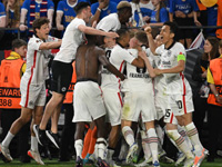 Через некоторое время номинальные гости едва не ответили сопернику любезностью на любезность – Голдсон отдал неудачный пас, Роде передачей в касание вывел Камаду на ворота, тот с линии вратарской попытался перебросить Макгрегора, однако сфера приземлилась сверху на «сетку». Шотландцы отошли назад. Однако от пропущенного гола это их не уберегло. На 69-й минуте немцы отличились после ввода мяча из аута. Костич с левого фланга выдал опасный прострел, Борре сыграл на опережении и с линии вратарской поразил ближний нижний угол – 1:1. Очень скоро Оливер Гласнер заменил Линдстрема, выпустив Хауге. А на 73-й минуте Райт за фол в центре поля на Костиче получил предупреждение. Только вслед за этим Джованни ван Бронкхорст провёл свою первую рокировку, выпустив Сакалу вместо Райта. «Айнтрахт» продолжал атаковать. На 76-й минуте Роде из центра штрафной откатил налево на Хауге, и тот выстрелил над дальней крестовиной. Через некоторое время мяч едва не залетел за шиворот Макгрегору, но тот сыграл бдительно и успел перевести игровой снаряд за перекладину. У «Рейнджерс» теперь впереди барражировал Сакала, и вскоре он напомнил о себе. На 83-й минуте Камара выдал передачу на ближний край штрафной на Сакалу, и тот с разворота то ли пробил, то ли прострелил, и Трапп накрыл мяч. Команды стали играть осторожнее, предвкушая дополнительные полчаса игры. Но «Айнтрахт» на исходе основного времени едва не забил. Костич получил диагональ на левом краю и практически с острого угла прострелил, мяч просвистел рядом со штангой, и Камада не успел подправить его в створ. А вслед за этим Якич вышел вместо Роде. Арбитр добавил пять минут, и на этом отрезке игра пошла уже преимущественно на половине поля «Айнтрахта», но немцы в обороне были надёжны. Встреча докатилась до дополнительного времени.