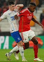 «Бенфике», потерпевшей накануне сокрушительное поражение от «Порту», необходимо было реабилитироваться перед своими болельщиками. Лиссабонцы завладели мячом и провели несколько атак, однако затем получили гол в свои ворота: Лоуренс набежал в штрафную и, откликнувшись на передачу Диоманде от лицевой, ударом головой отправил мяч в сетку. Шотландцы на этом не успокоились и били по воротам Трубина издали. А «Бенфика» упустила реальный шанс отыграться: поспевшему на добивание Кабралу помешал забить Голдсон, в подкате заблокировавший удар. В концовке хозяева прижали «Рейнджерс» к воротам и это принесло успех. Суттар после подачи углового на ближнюю штангу сыграл рукой. Рефери, посмотрев повтор, назначил пенальти, который уверенно реализовал Ди Мария, дождавшийся, когда голкипер завалится в угол. Однако в компенсированное время гости вновь вышли вперёд усилиями Стерлинга, замкнувшего прострел с левого края штрафной в исполнении Силвы. После перерыва «орлы» продолжали давить, нагружая штрафную Батленда мячами, а шотландцы огрызались в редких контратаках. И это давление принесло свои плоды. Опытный Голдсон отправил мяч в свои ворота, пытаясь прервать навес Ди Марии. Но на победу сил у «Бенфики» не осталось.