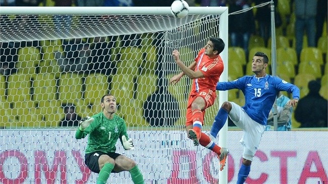 азербайджанского защитника, но тот здорово сыграл в отборе и вынес снаряд за