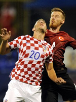 Встреча началась активно. Причем удивлять стали гости, нежели хозяева поля. Турок с говорящей фамилией Мор решил устроить проверку на прочность нервов соперника. Эмре получил мяч на правом фланге, чуть влево отошел, выстрелил и ведь едва не попал в цель, немного выше перекладины просвистел мяч. Йокушлу потом мог тоже огорчать оппонента, но и ему не удалось нормально пробить по воротам. Надо было блеснуть и хорватам. Они это сделали, довольно быстро. Видимо, оправились от натиска со стороны конкурента. Модрич отпасовал на правый фланг, а оттуда пошел прострел на ближнюю штангу, вот уже Манджукич разрядил, но Бабаджан сумел задеть мяч и перевести его прямо в штангу. «Снаряд» уже у Пьяци оказался, который пробил по пустым воротам, но только перекладина была задета, не больше. Упустили голевой момент футболисты принимающей стороны. Мор же продолжал нагнетать обстановку во владениях соперника. Вот он на левом краю чужой штрафной открылся, на рывке отправил себе мяч мимо защитника, а потом с острого угла пробил по воротам Калинича, кипер выручил. Затем удар уже по воротам противоположной стороны пришелся, Пьяцу оформил выстрел, но в перекладину угодил «снаряд», после чего отскочил он в поле. Затем уже Перишич на правом краю около штрафной в дальний угол разрядил, мяч упал на перекладину и улетел прочь. Вот так разошлись команды, любо дорого смотреть на такую дуэль яркую!