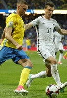 Шведы начали поединок очень агрессивно, сразу бросившись в атаку. Видимо, понимали, насколько важен именно этот матч, постарались застать французов врасплох, осознавая, что те на выезде могут раскачиваться довольно долго. Так и получилось. Мяч заметался около штрафной гостей, возникло определенное напряжение, нервозность около ворот Льориса. При этом серьезных острых моментов не возникало из-за хаоса, который больше шел на пользу обороняющейся стороне. Французы достаточно быстро пережили этот натиск Швеции, сумели сбить запал противника, подровнять игру. Под это дело получилось совершить несколько перехватов, перейти в контрнаступление, и вот уже напор Швеции не так силен. Резкие вертикальные передачи в сторону ворот шведов создавали определенные неприятности хозяйской обороне, которая не слишком уверенно защищалась. Скорее самим французам не удавалось доводить свои выпады до ума – слишком торопливо, сыровато. Впрочем, это можно было списать на вкатку в игру. Гости довольно удачно прорывались вперед по флангам, однако подачи цели не достигали. Пытались разыгрывать комбинации с дальними ударами – плотности обороны Швеции хватало, чтобы принимать их на себя. Словом, французы так ловко перевернули игру, но при этом остроты не добавили. Шведы старались больше распоряжаться мячом, так же не пробиваясь к воротам. В середине тайма у хозяев получалось чуть лучше совершать проникновения к воротам соперника, но до ударов не доходило – все блокировалось или перехватывалось. При довольно неплохой динамике игры с обеих сторон, при хорошем подборе исполнителей обеим командам не хватало какой-то слаженности, завершенности в действиях и четкости. А индивидуально никто не мог взять на себя игру так, чтобы преодолеть оборонительные редуты. В защите обе команды играли успешнее, чем в наступлении. Это приводило порой к эдаким зависаниям, когда игра не давала ничего нового, а футболисты просто тратили время. Особая ответственность лежала на тех футболистах, которые должны были своими острыми передачами разрезать защиту соперника. Но Погба, Пайет, Форсберг молчали. Хотя последнему удавалось порой протиснуть мяч в штрафную. И все же без удара. И только к заключительной части тайма начала клеиться созидательная игра. Причем без каких-то изысков. Французы, давя на одно и то же, своего добивались, используя потери концентрации защитниками шведов. Хороший момент имел Жиру, который замыкал подачу Менди – в створ немного не попал. Ранее Лустиг подключался к контратаке шведов, но тоже бахнул сходу мимо. Но игра раскрылась, и это быстро привело к голам. Причем французы открыли счет просто шикарно. Сама подача справа вышла посредственной, а скидка досталась на углу штрафной Жиру, который лихо завернул снаряд по дуге точно под штангу. 0:1. Изумительный удар получился. Французы застали соперника врасплох и могли бы его добивать, но нарвались на ответный выпад причем в таком же эффектном стиле. Такой же почти отскок на краю штрафной выловил Дурмаз, который без раздумий пробил в дальний угол. 1:1. Яркой запятой закончился первый тайм.