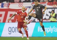 В середине тайма картина игры в лучшую сторону для команды Карпина не изменилась. Футболисты сборной Хорватии очень уверенно контролировали мяч, легко продвигались вперёд, и наращивали своё давление на оборону нашей команды. Хозяева практически безвылазно владели игровым снарядом на чужой половине поля. Дополнительной проблемой для россиян стал тотальный проигрыш борьбы за подборы на подступах к штрафной площади, благодаря чему команде Далича удавалось быстро возвращать себе контроль над мячом. В эти минуты несколькими опасными ударами отметился Брозович. Один из них в эффектном прыжке потащил Сафонов. Много работы было у Матвея в данном игровом отрезке. К счастью, вратарь сборной России действовал уверенно, без единого намёка на панику. Команда Далича часто доводила свои атакующие акции до логического завершения. Кроме того, хорваты наращивали свой отрыв от соперника не только по числу ударов по воротам, но и по заработанным “корнерам”. Правда, конвертировать количество угловых в качество хозяевам не удавалось. Также команда Карпина предоставляла хорватам чересчур много свободы на флангах, откуда раз за разом следовали потенциально опасные подачи со стороны “шашечных”. В частности, на 35-й минуте Перишич опасно пробил в касание после навеса с правого края, однако в створ Иван не попал. Концовку тайма сборная Хорватии постаралась провести максимально мощно, надеясь конвертировать подавляющее игровое преимущество в забитый мяч до перерыва, но осуществить желаемое на практике ей не удалось. Зато “нашим парням” наконец-то удалось организовать несколько вылазок на чужую территорию. Команда Карпина даже пару стандартных положений заработала, розыгрыши которых, к сожалению, ничем примечательным не завершились. Так ни одного удара по воротам Грбича сборная России и не нанесла в первой сорокапятиминутке.